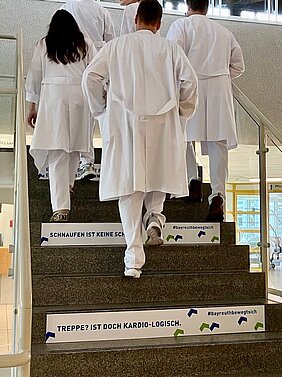 Zu diesem Zweck wurden unter dem #bayreuthbewegtsich humorvolle Sprüche und attraktive Grafiken erstellt, um Bürgerinnen und Bürger, Mitarbeiterinnen und Mitarbeiter zum Treppensteigen zu motivieren. Ab sofort sind motivierende Nudges im Neuen Rathaus am Luitpoldplatz, im Landratsamt Bayreuth, im RW21 und im Klinikum Bayreuth zu finden. Wer an diesen Orten vorbeikommt, entdeckt lustige Sprüche, wie z.B. „Leider steil, leider geil!“, „Schrittchen, statt Schnittchen“ oder „Bring doch mal deinen Herzschlag mit nach oben“.