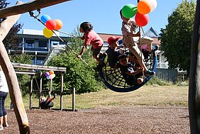 Toben, spielen, Spaß haben: Kinder der Kindertageseinrichtung „Wasserflöhe“ am Bodenseering haben den runderneuerten Spielplatz am Klinikum Bayreuth eingeweiht