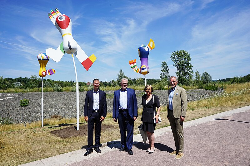 Der Förderverein Skulpturenmeile und die Klinikum Bayreuth GmbH haben das Projekt gemeinsam angeschoben. An einem wachsenden Krankenhausstandort war irgendwann kein geeigneter Platz mehr für die farbig-fröhlichen Figuren, in die an Vögel im Flug erinnern. Die Klinikum Bayreuth GmbH übereignete das dreiteilige Werk an den Verein Skulpturenmeile und unterstütze das Projekt. Der Verein fand einen Restaurator und viele weitere helfende Hände. Auch wenn es fast zehn Jahre gedauert hat – jetzt steht die Skulptur wie neu an einem frequentierten Platz.