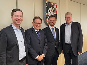 Prof. Dr. med. Christian Heim (zweiter von rechts) wird neuer Direktor der Klinik für Herz- und Gefäßchirurgie an der Klinikum Bayreuth GmbH. Aufsichtsratsvorsitzender Oberbürgermeister Thomas Ebersberger (rechts) Zweckverbandsvorsitzender Landrat Florian Wiedemann(links) und Geschäftsführer Dietmar Pawlik gratulierten zur Ernennung.