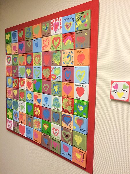 Es sind 82 gezeichnete Herzen auf einer kleinen Leinwand. Die heute zwischen zwölf Jahren bis zu einigen Monaten jungen Kinder gestalteten die Bilder ganz individuell bei einer Aktion am Weltfrühchentag. Jetzt zieren sie auf einer großen Tafel als Gesamtkunstwerk den Eingang der Frühgeborenenstation. Alle kleinen Künstler verewigten sich mit Namen und Geburtsgewicht auf ihrem Herzbild. Bei den Mitarbeitern weckt jedes der 82 Kunstwerke ganz besondere Erinnerungen an ihre ehemaligen kleinen Patienten und deren Familien.
