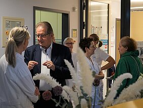 „Es sind oft nicht die großen Dinge, die den Zusammenhalt von Teams hervorrufen, sondern solche zentralen Punkte, wo man sich wohlfühlt und Zeit zusammen verbringt. Insofern ist es schön, dass es gelungen ist, das Team der Palliativstation hier mit der neuen Küche für die kommenden Jahre wieder eine Infrastruktur zu schaffen, die das Wohlfühlen für Patientinnen und Patienten und des Teams sicherstellt“, sagt Dietmar Pawlik, Geschäftsführer der Klinikum Bayreuth GmbH anlässlich der Einweihungsfeier der neuen Küche auf der Palliativstation.