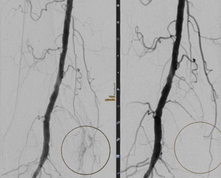 Erfolgreiche TAPE bei schmerzhafter Kniegelenkarthrose einer 88-jährigen Patienten. Durch die superselektive Embolisation der oberen Kniegelenkarterie wurde die entzündliche Mehrdurchblutung blockiert (siehe Kreise, links vor Embolisation, rechts nach Embolisation), woraufhin die Schmerzen nachließen.