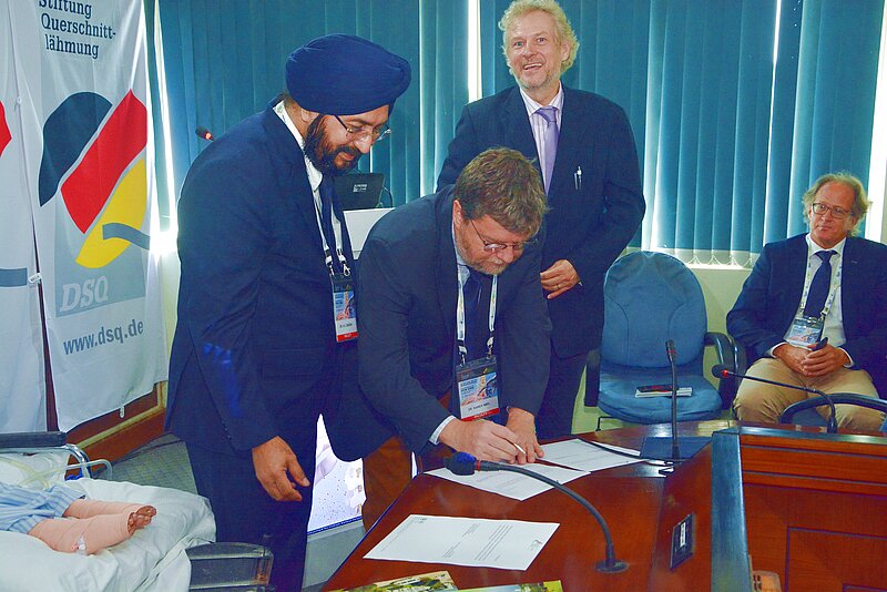 Dies wurde auch bei der Spendenübergabe, die jetzt in New Dehli stattfand, deutlich. Die beiden Kinder, deren weitere Behandlung jetzt sichergestellt ist, waren dabei. Sie hatten Verletzungen des Rückenmarkes im Halsbereich erlitten. Mit Hilfe der Spende wird jetzt versucht, die dauernde Beatmung abzubauen. Vertreter der Deutschen Botschaft in Indien haben die Vertreter der Deutschen Stiftung Querschnittlähmung maßgeblich unterstützt. Und auch einer der ranghöchsten Politiker Deutschlands schob mit an: Bundestagspräsident Dr. Wolfgang Schäuble gehört dem Kuratorium der Deutschen Stiftung Querschnittlähmung an.