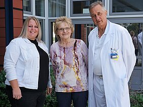 Gisela Frisch (mitte) litt Jahre lang unter extremer Luftröhrenverengung. Klinik-Koordinatorin Katrin Nureddin und Klinikdirektor Dr. Thomas Hoppert sind für sie da. Foto: Klinikum Bayreuth GmbH
