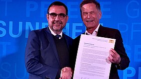 Mit seiner Unterschrift macht Prof. Dr. Hans-Rudolf Raab (rechts), Medizinischer Geschäftsführer der Klinikum Bayreuth GmbH, klar: Wir unterstützen die Initiative des Bayerischen Gesundheitsministers Klaus Holetschek.