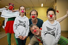 Die Schülersprecher Nike Schimanski und Jannik Sieron sowie Rektorin Stefanie Schmidt trafen ‚Prof. Dr. Fritz´l Fußtaps‘ und ‚Frau Dr. Trudi Eierfleck‘ auf der Kinderstation im Klinikum Bayreuth. Die beiden freuten sich über die 600 Euro-Spende riesig. In der Kinderklinik des Klinikums, wie in 100 weiteren bayerischen Krankenhäusern und Pflegeeinrichtungen, sind professionelle Clowns vom Verein ‚KlinikClowns Bayern e.V.‘ regelmäßig im Einsatz. Sie bringen Spaß, Freude und neue Zuversicht und tragen so viel Positives zum Gesundheitszustand kranker oder pflegebedürftiger Menschen bei. Fritzl Fußtaps und Trudi Eierfleck bedankten sich herzlich für die Unterstützung der Schülerinnen und Schüler. Denn dass sich bereits Kinder im Grundschulalter für Gleichaltrige Patienten einsetzen, finden die KlinikClowns großartig. Ausführliche Informationen über die KlinikClowns und Unterstützungsmöglichkeiten findet man unter www.klinikclowns.de
