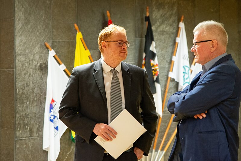 Prof. Dr. Dominik Wiedemann im Gespräch mit Oberbürgermeister Thomas Ebersberger.