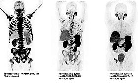 Das Bild zeigt die Wirkung einer Lutetium-177-PSMA Therapie innerhalb von vier Zyklen. Schwarz sind die Krebszellen markiert.