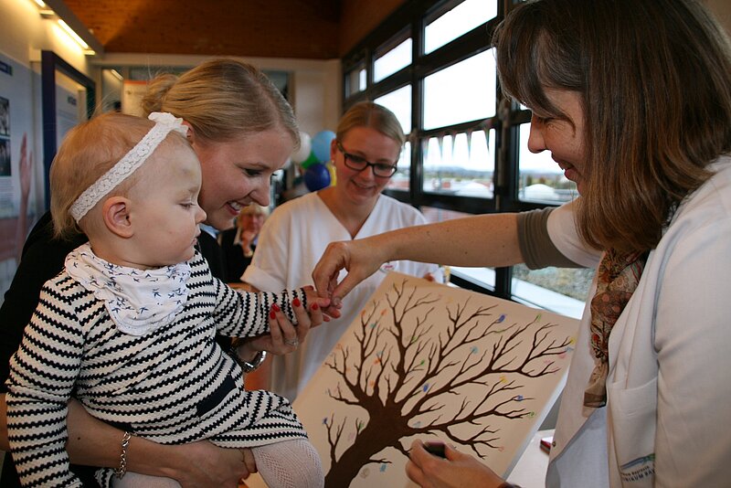 Lillys Fingerabdruck ist ein kleines Blatt am Erinnerungsbaum für den 8. Weltfrühchentag. Jetzt zieren 104 Blätter den bunten Baum und erinnern die Schwestern und Ärzte der Kinderklinik an ihre ehemaligen Frühchen, die am 8. Weltfrühchentag zu Besuch waren.