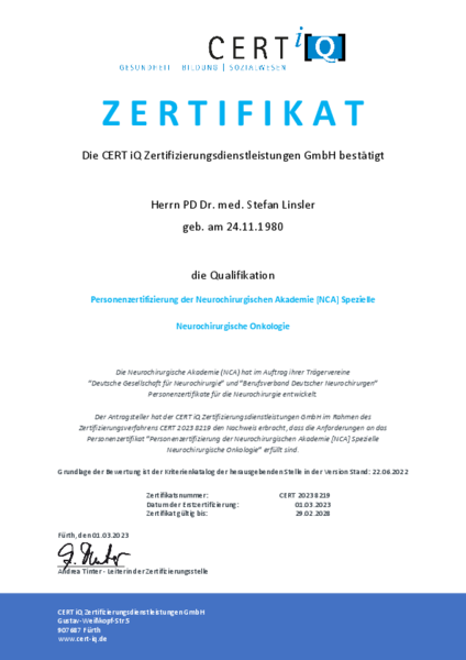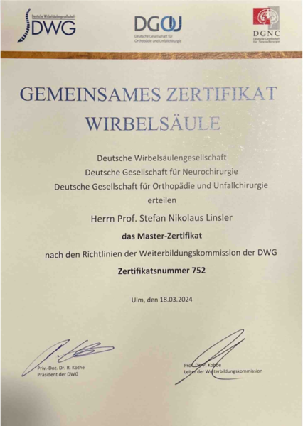 Facharzt für Neurochirurgie Masterzertifikat Wirbelsäulenchirurgie der Deutschen Wirbelsäulengesellschaft EuroSpine Diploma