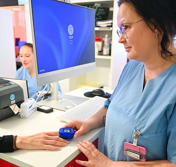 Triage/Erstsichtung: Um die Behandlungsdringlichkeit festzustellen, stellen wir Ihnen einige Fragen zu Ihren Symptomen sowie zu dem Grund Ihres Kommens und messen in den meisten Fällen Puls, Sauerstoffsättigung und Ihre Körpertemperatur.