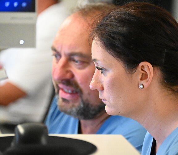 Arztgespräch und Diagnostik: Etwa zwei Stunden dauert es, bis die Ergebnisse der Blutuntersuchung vollständig vorliegen. Parallel dazu oder auch davon abhängig wird Ihre behandelnde Ärztin oder Ihr behandelnder Arzt weitere Untersuchungen in die Wege leiten (z.B. Röntgen, Ultraschall, Computertomografie). Nach einer Übergabe werden Sie in einen der Behandlungsbereiche (konservativ, operativ oder Schockraum) von der Pflegekraft übernommen und bis zur Entlassung oder Verlegung pflegerisch betreut. Unterstützt wird die Fachkraft ggf. von Krankenpflegefachhelfenden, Auszubildenden und studentischen Hilfskräften.