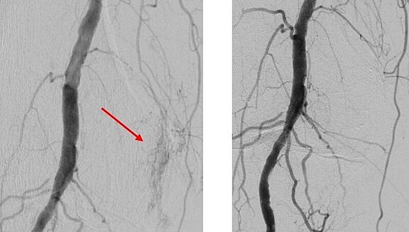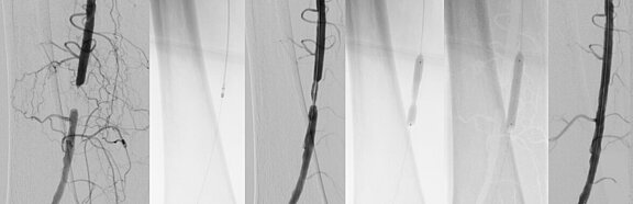 Die Behandlung verengter oder verschlossener Blutgefäße - mit Ausnahme des Herzens - macht einen Großteil der bei uns durchgeführten Eingriffe aus. Dazu zählt die Therapie der peripheren arteriellen Verschlusskrankheit (Schaufenstererkrankung), Nierenarterienstenosen oder Engstellen der darmversorgenden Gefäße. Ein weiterer Teilbereich ist die Behandlung von Komplikationen bei Dialyseshunts. Hierbei kommen verschiedenste hochmoderne Techniken zum Einsatz. Diese beinhalten die Aufdehnung von Engstellen mit einem Ballonkatheter oder die Stentimplantation (Angioplastie), das Absaugen von Thromben (Aspirationsthrombektomie), aber auch weitere hochspezifische Verfahren wie z.B. die Verwendung von „Gefäßfräßen“ (sog. Atherektomie) oder auch der Einsatz von Stoßwellen (Lithoplastie). Auch venöse Engstellen oder Gefäßverschlüsse können unter Einsatz endovaskulärer Techniken behandelt werden. Hierzu zählen zum Beispiel tumorbedingte Einengungen der großen Hohlvene oder auch Thrombosen.Die Behandlung von Patientinnen und Patienten mit Gefäßerkrankungen erfolgt dabei in enger interdisziplinärer Absprache mit den Kollegen der Gefäßchirurgie, um die besten Behandlungsergebnisse zu erzielen.