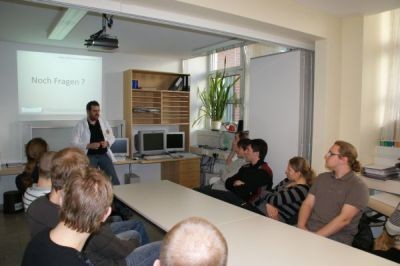 In einigen Vorträgen erfuhren die jungen Leute dann von den in der Abteilung tätigen Medizinphysikexperten, welche Aufgaben auf sie in Strahlentherapie und Nuklearmedizin warten könnten, wie man die Qualifikation zur/m Medizinphysikexpertin/en erlangt und welche Hürden der Gesetzgeber vorgesehen hat. Sie wurden informiert, wie gut die Berufsaussichten in diesem Zweig der Naturwissenschaften sind und wo sie tätig werden könnten. Die Vorträge der leitenden Ärzte der Strahlentherapie und der Nuklearmedizin schilderten die alltäglichen Abläufe in den Abteilungen und das Zusammenspiel zwischen Arzt und Physiker/in.