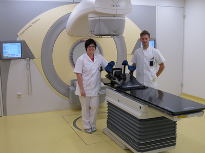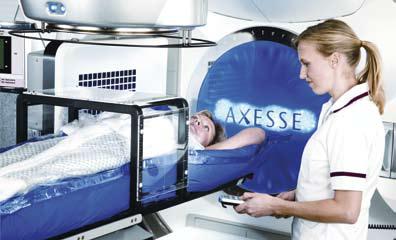 Elekta Axesse ist eine neue Hochpräzisionsbestrahlungsanlage, die in der Strahlentherapie eingesetzt wird, um das Wachstum von Tumoren zu hemmen oder diese völlig zu zerstören. Eine ausgeklügelte Technik verbindet Computertomographie, robotergestützte Patientenlagerung und Bestrahlungstechnik in einem System. Diese Kombination bietet Patienten mehr Sicherheit durch zielgenauere und angepasste Bestrahlung. Gleichzeitig werden Nebenwirkungen reduziert.