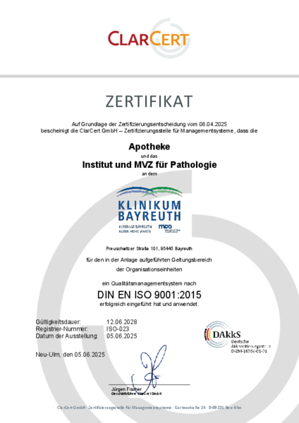 Qualitätsmanagement und gesetzlich verpflichtende, aber auch freiwillige Qualitätssicherungsmaßnahmen an denen sich die Klinikum Bayreuth GmbH beteiligt, schaffen Transparenz und vergleichbare Ergebnisqualität. Festgelegte Standards bieten Sicherheit und sind Voraussetzung für eine umfassende Betreuung auf höchstem Niveau. Die intensive Zusammenarbeit aller Berufsgruppen in der Klinikum Bayreuth GmbH verbessert die Organisation und die Abläufe zum Wohle unserer Patienten.