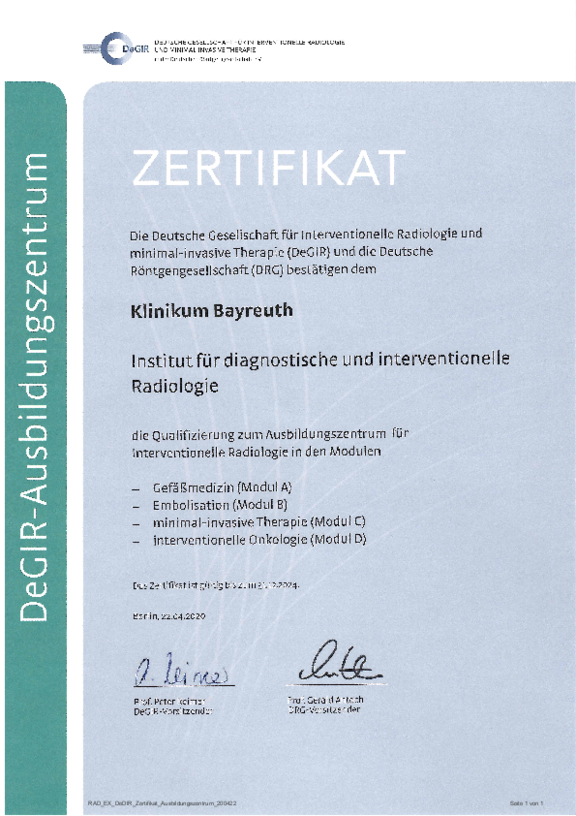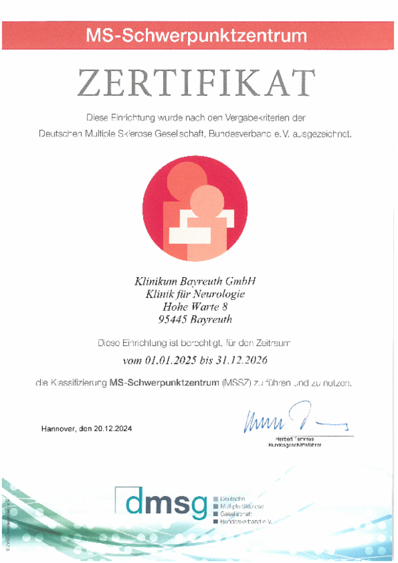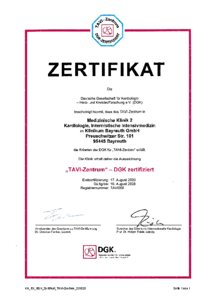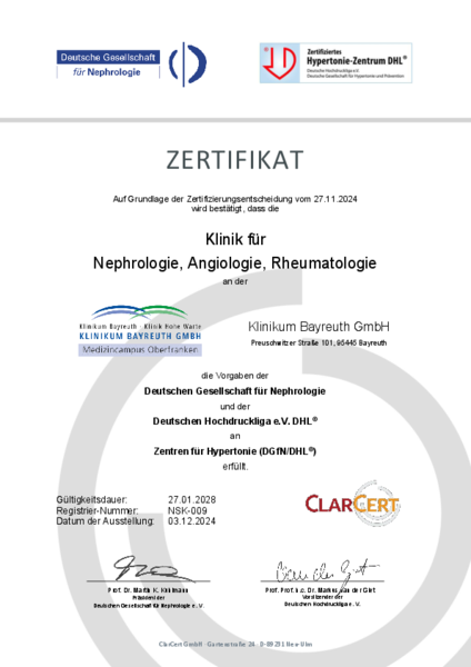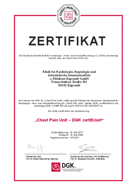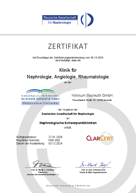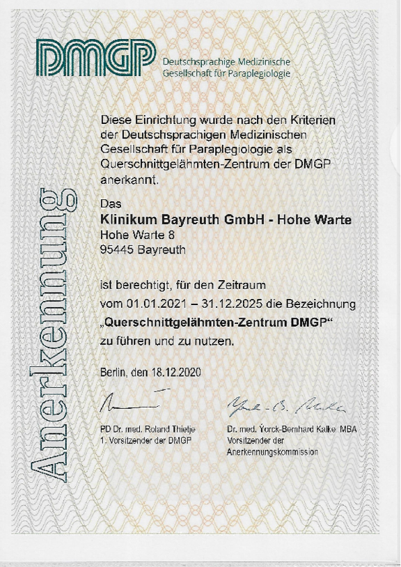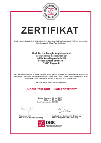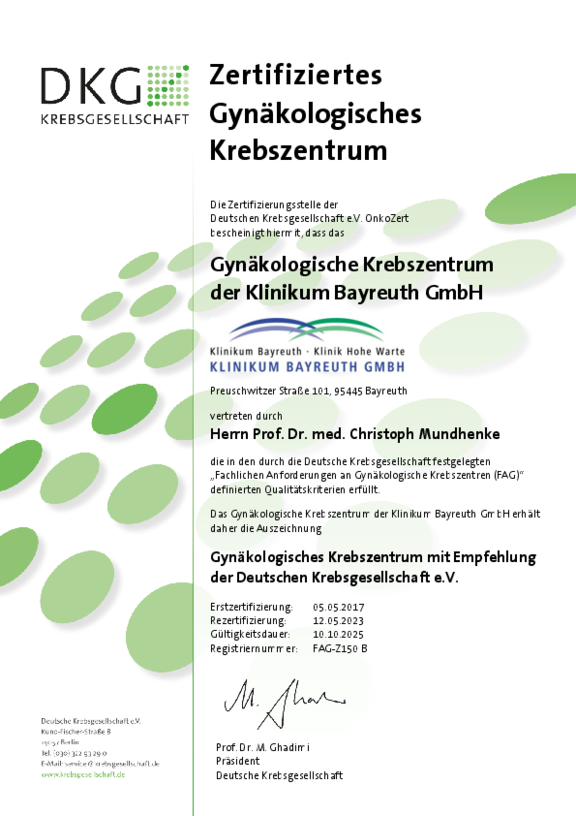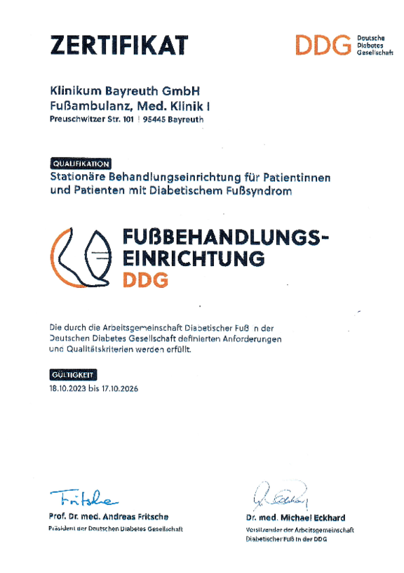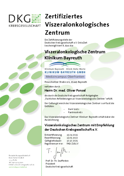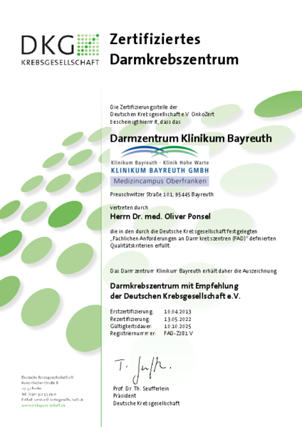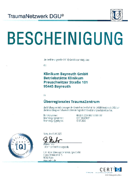 Zusätzlich zum Qualitätsmanagement-Systems kann die Klinikum Bayreuth GmbH Zertifizierungen nach den Anforderungen unterschiedlicher Fachgesellschaften vorweisen: